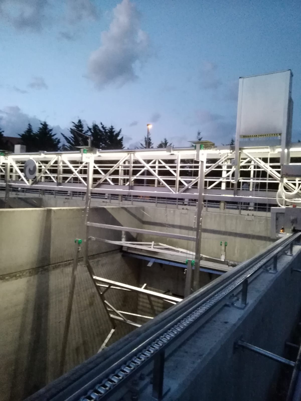 Pokretni most sa zgrtačima mulja je raspona cca. 19,0 metara i proteže se preko tri paralelne linije naknadnog taložnika. Kreće se po dvije tračnice svaka dužine cca. 56,0 metara, usidrene na vrhu rubnih zidova bazena naknadnog taložnika. Konstrukcija mosta podužnog zgrtača opremljena je podom te zaštitnom dvostranom ogradom sa rukohvatom. Kod pokretnih dijelova podužnog zgrtača predviđen je elektromotorni pogon.